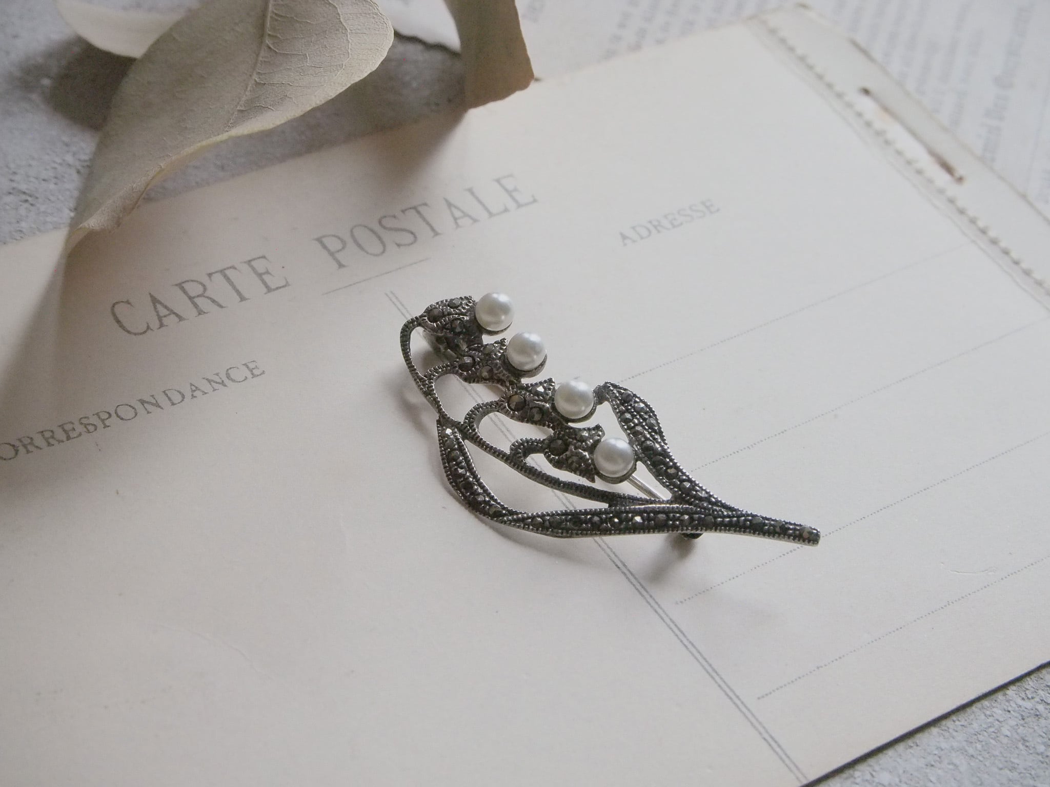 シルバーとマーカサイトの落ち着いた輝きにフォーパールの上品な白さが映え、清廉な印象です。