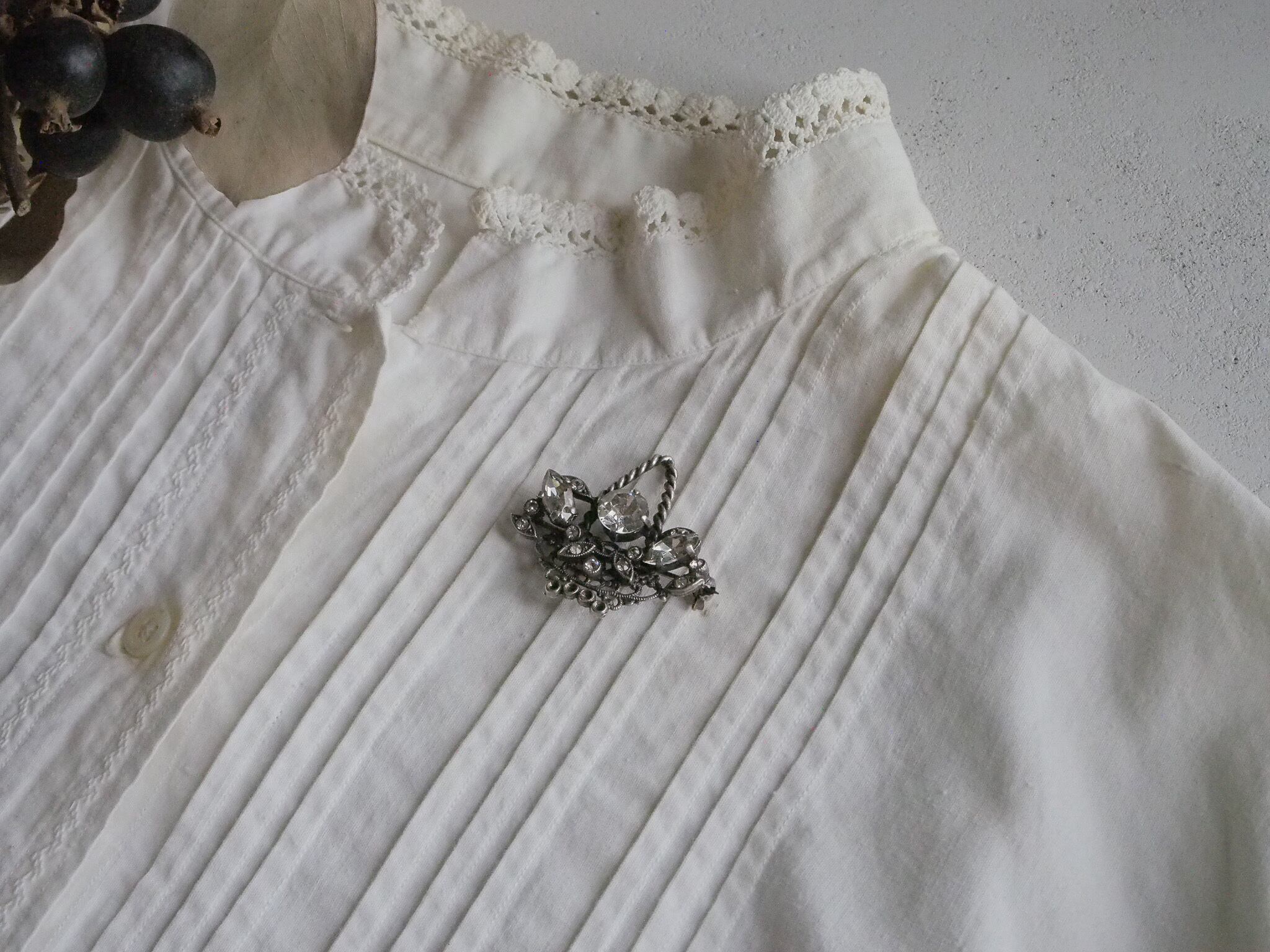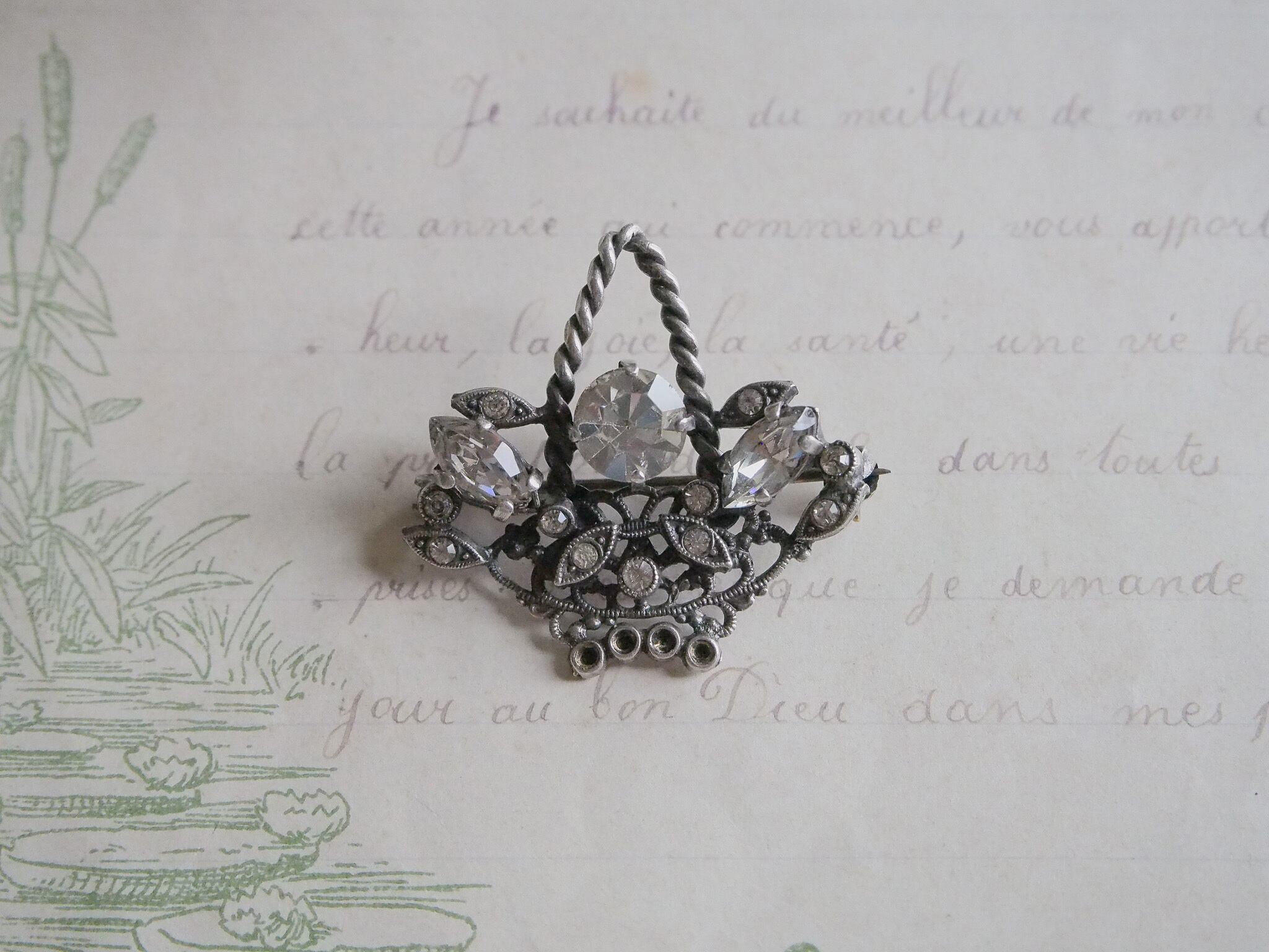 きらきらと輝く大きなガラスが入った花かごのブローチです。