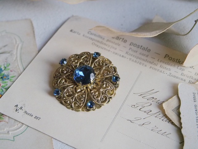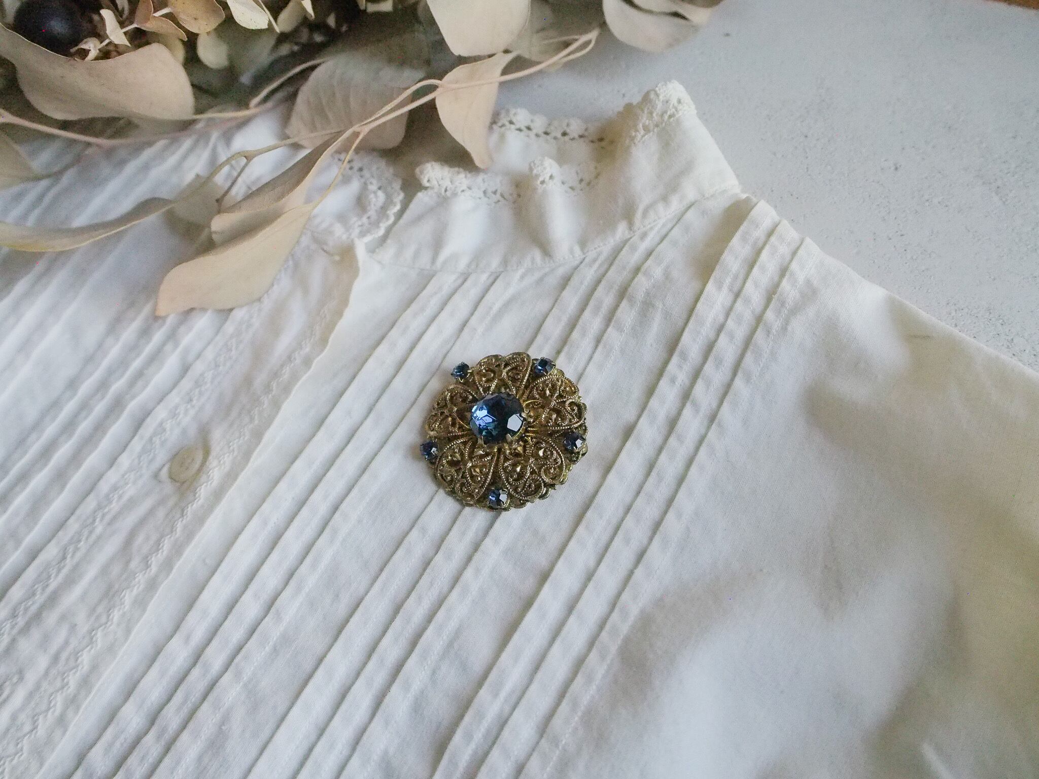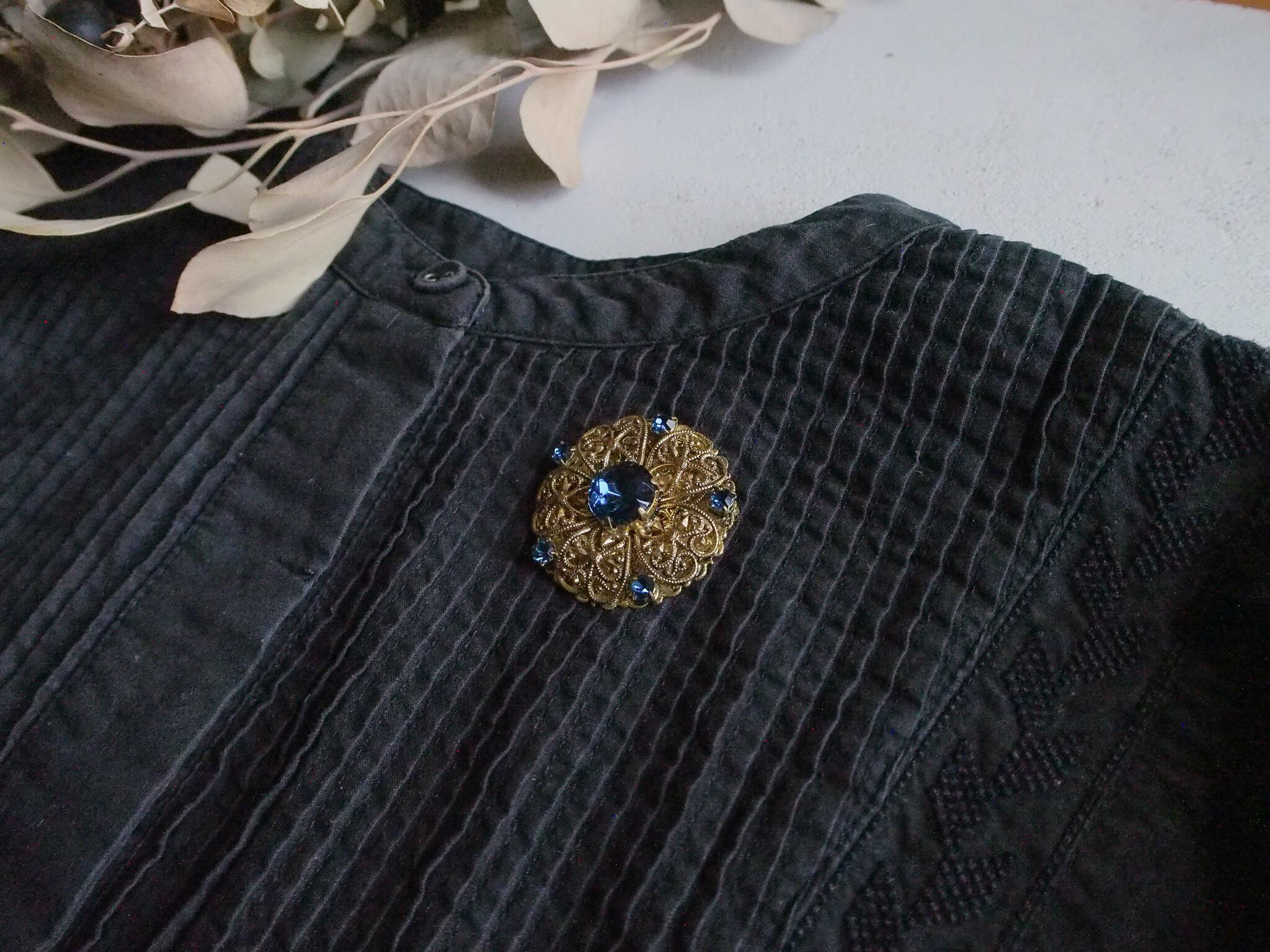 深海のような青いガラスが美しい、チェコスロバキアのヴィンテージブローチです。