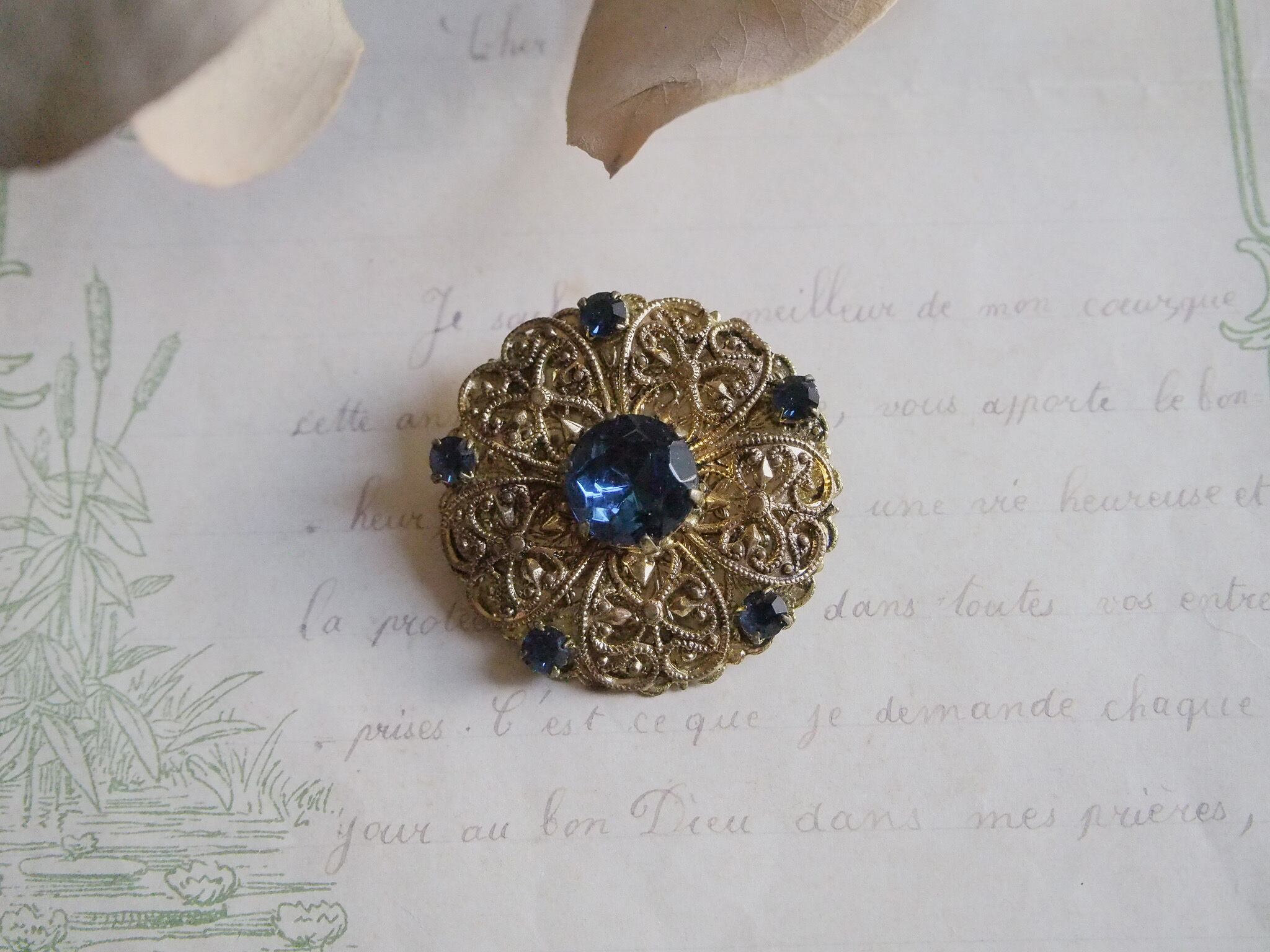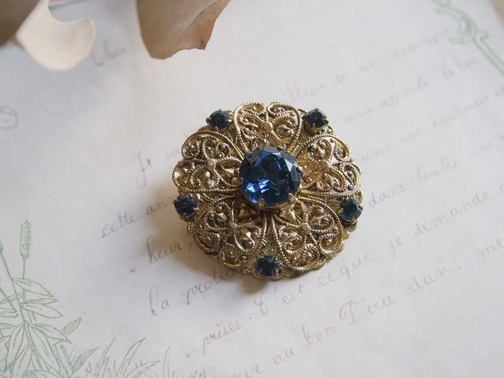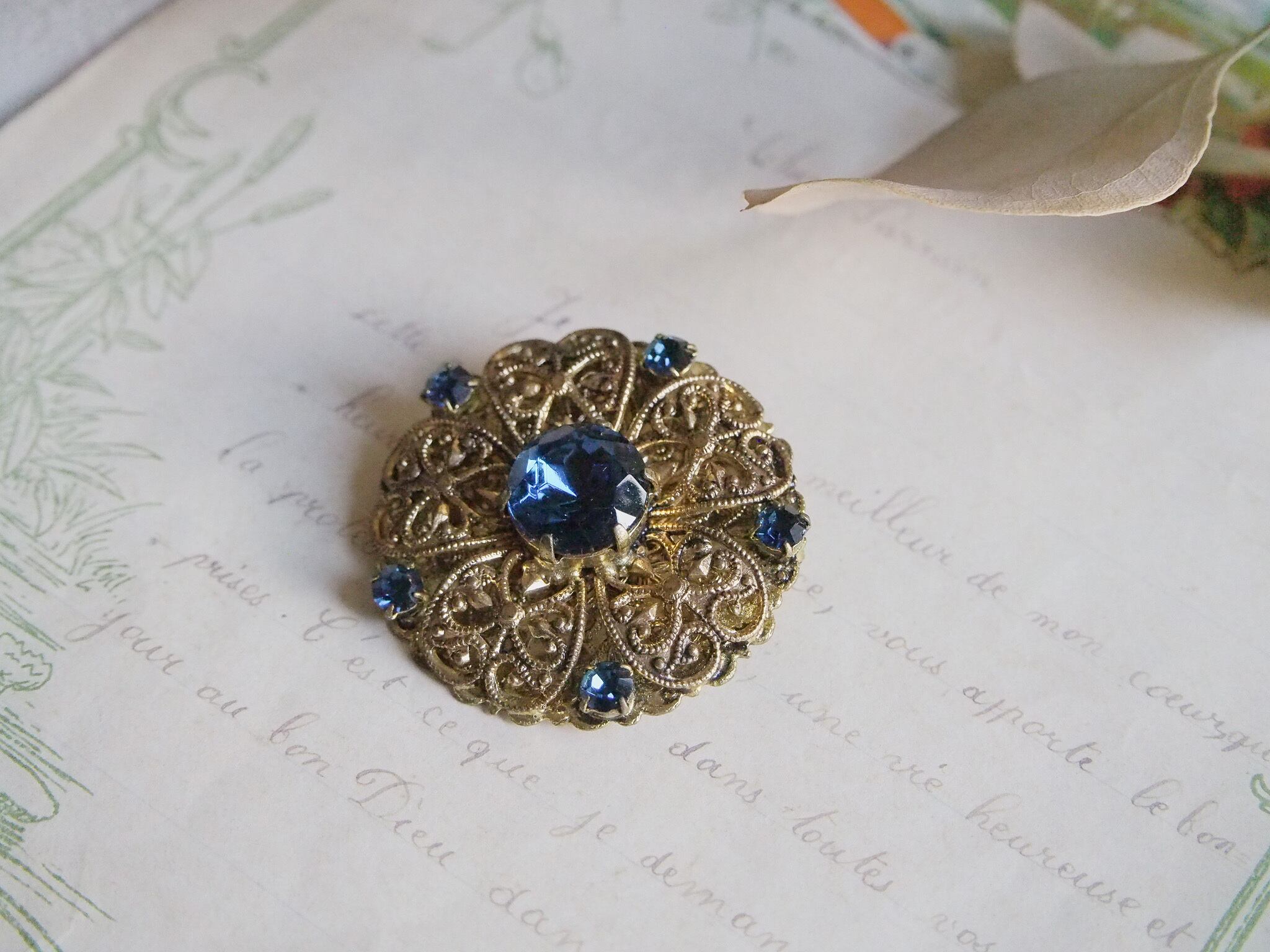 深海のような青いガラスが美しい、チェコスロバキアのヴィンテージブローチです。