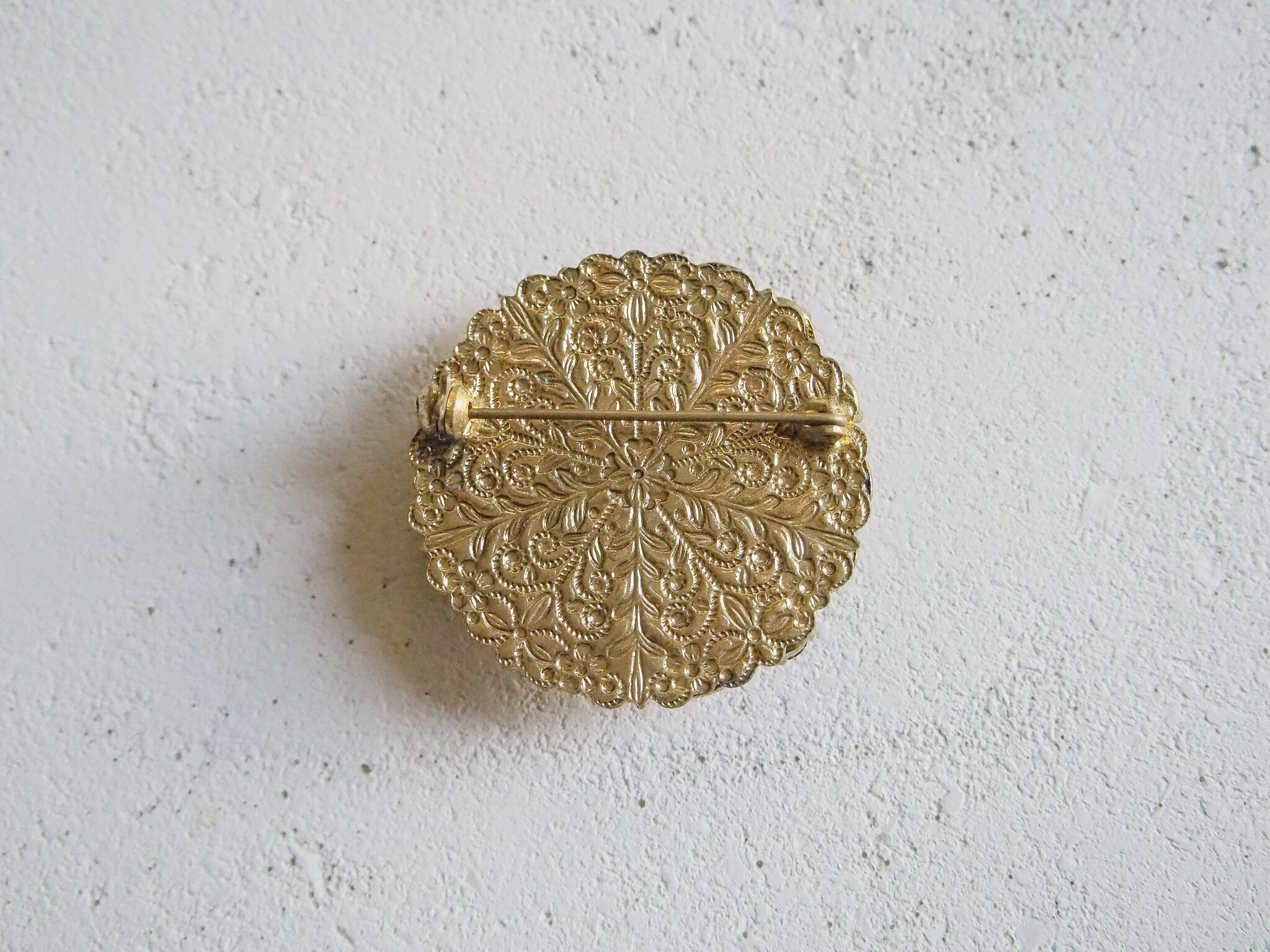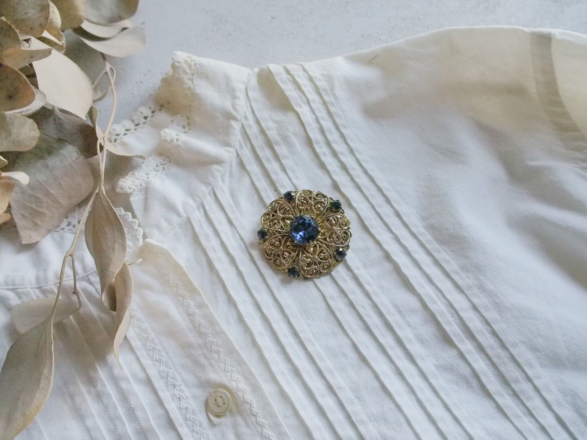 直径4㎝ほどのサイズですが、軽い金属がベースなので重すぎることはなく、厚手のブラウスくらいの生地からつけていただけそうです。