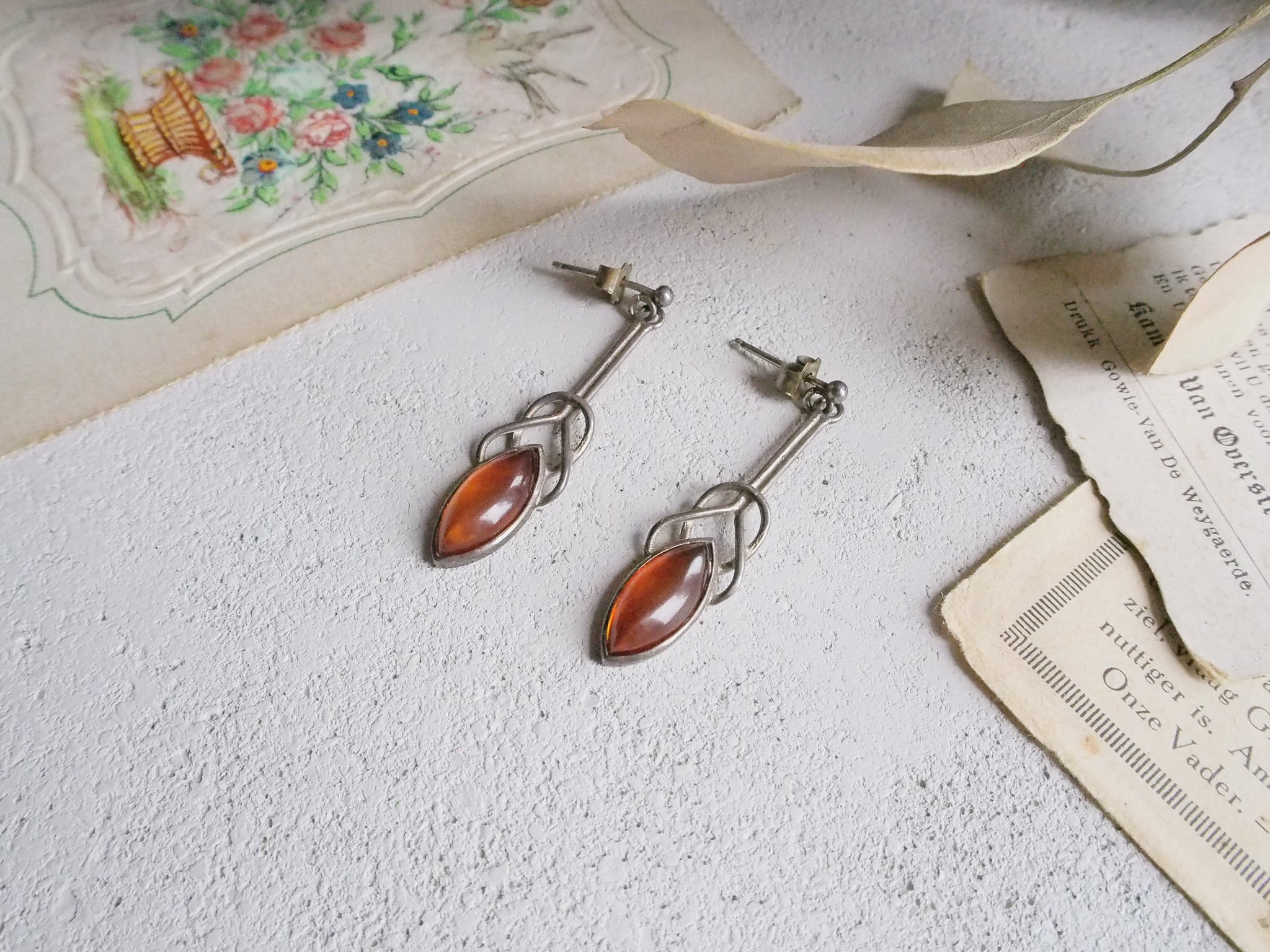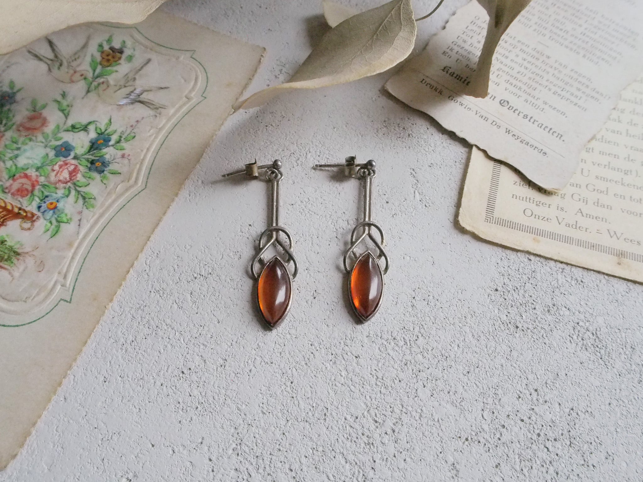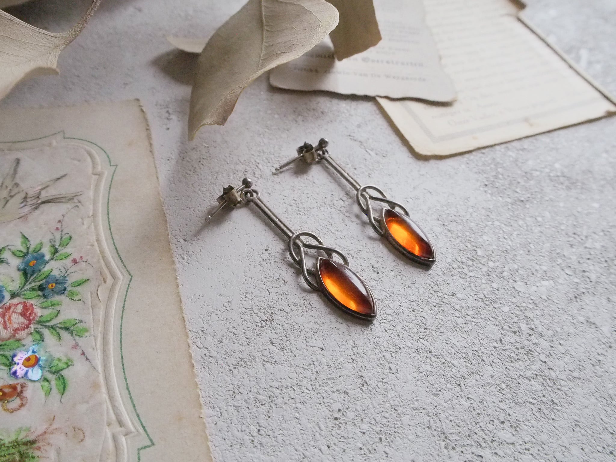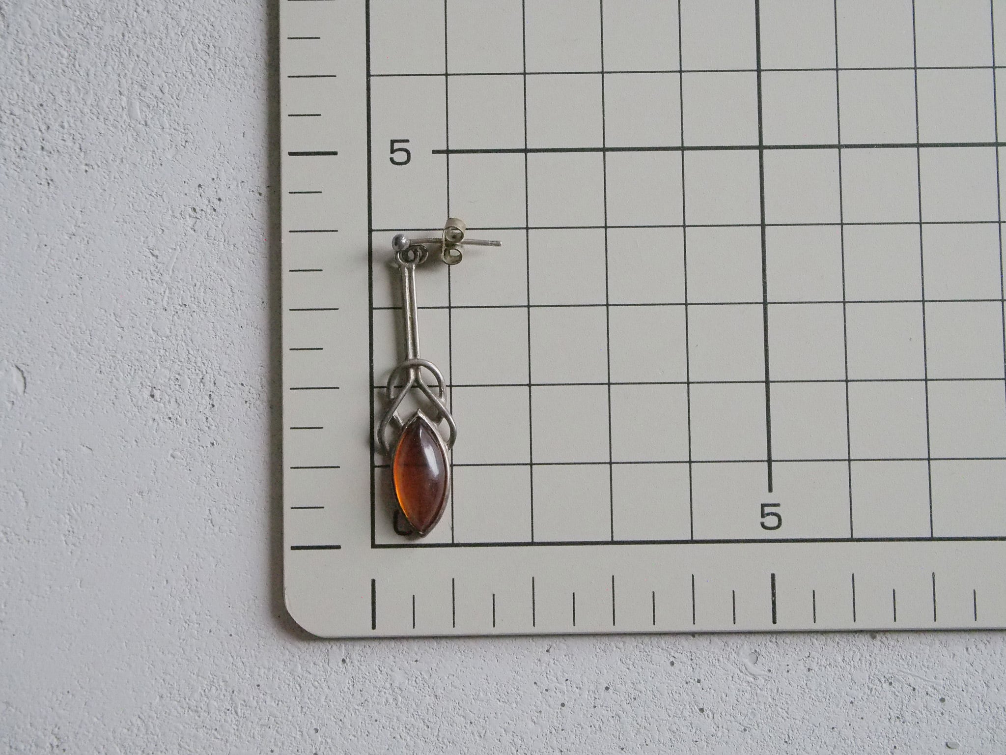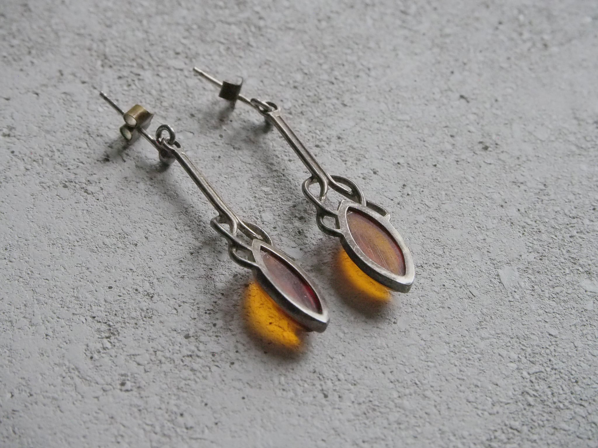 SOLD OUT アンバー色のガラスがはめ込まれた、アールデコ様式のヴィンテージピアスです。