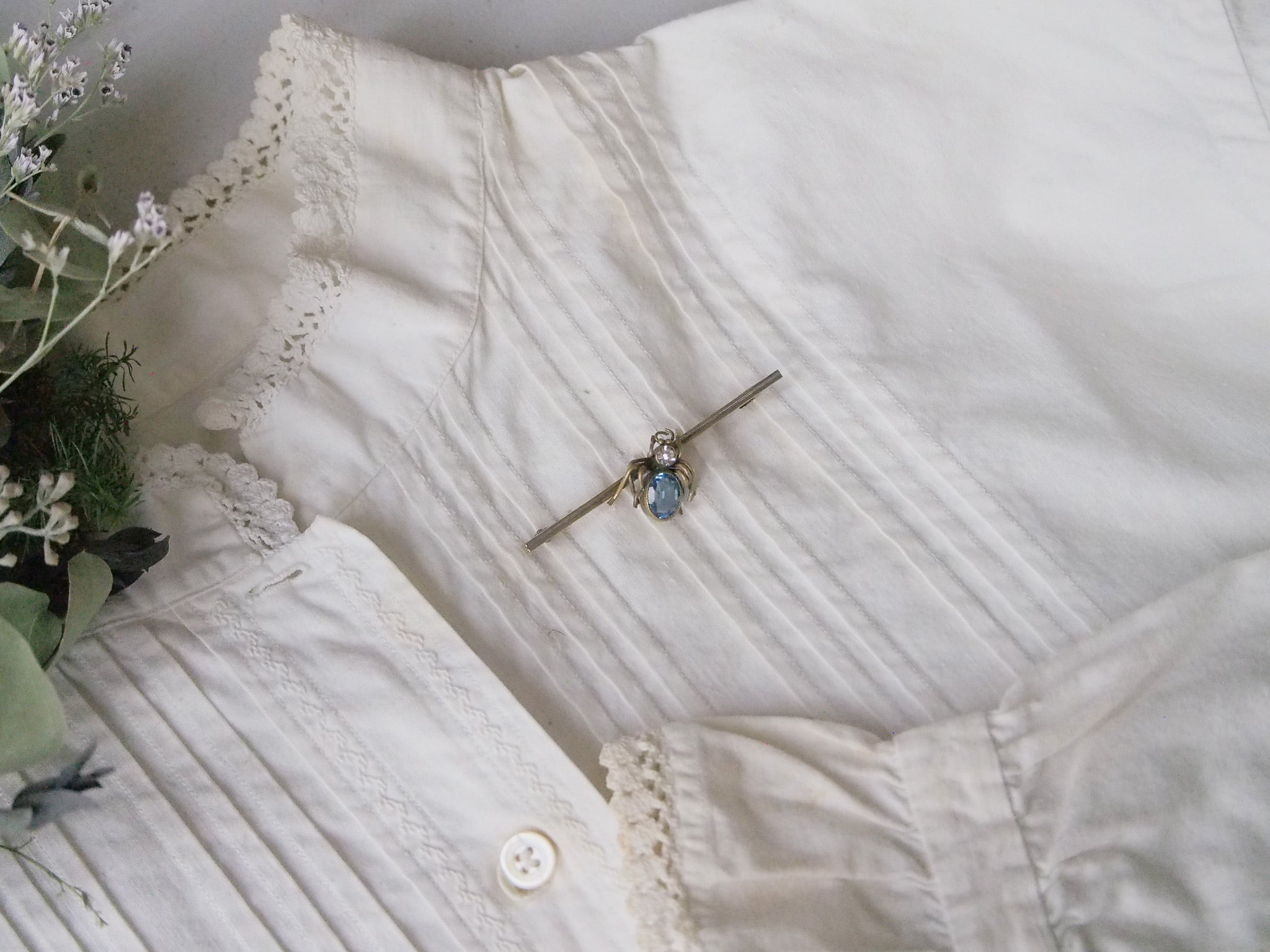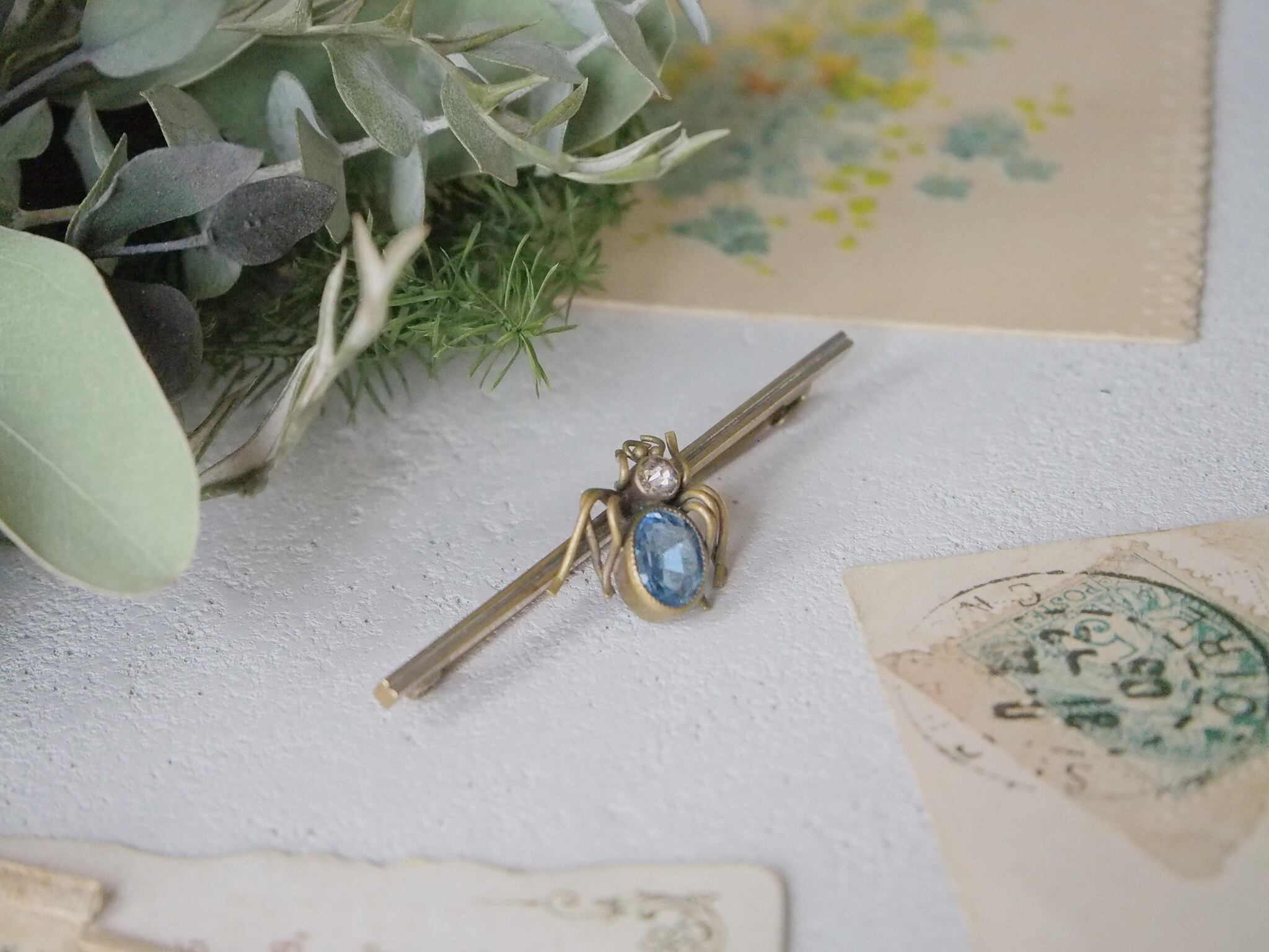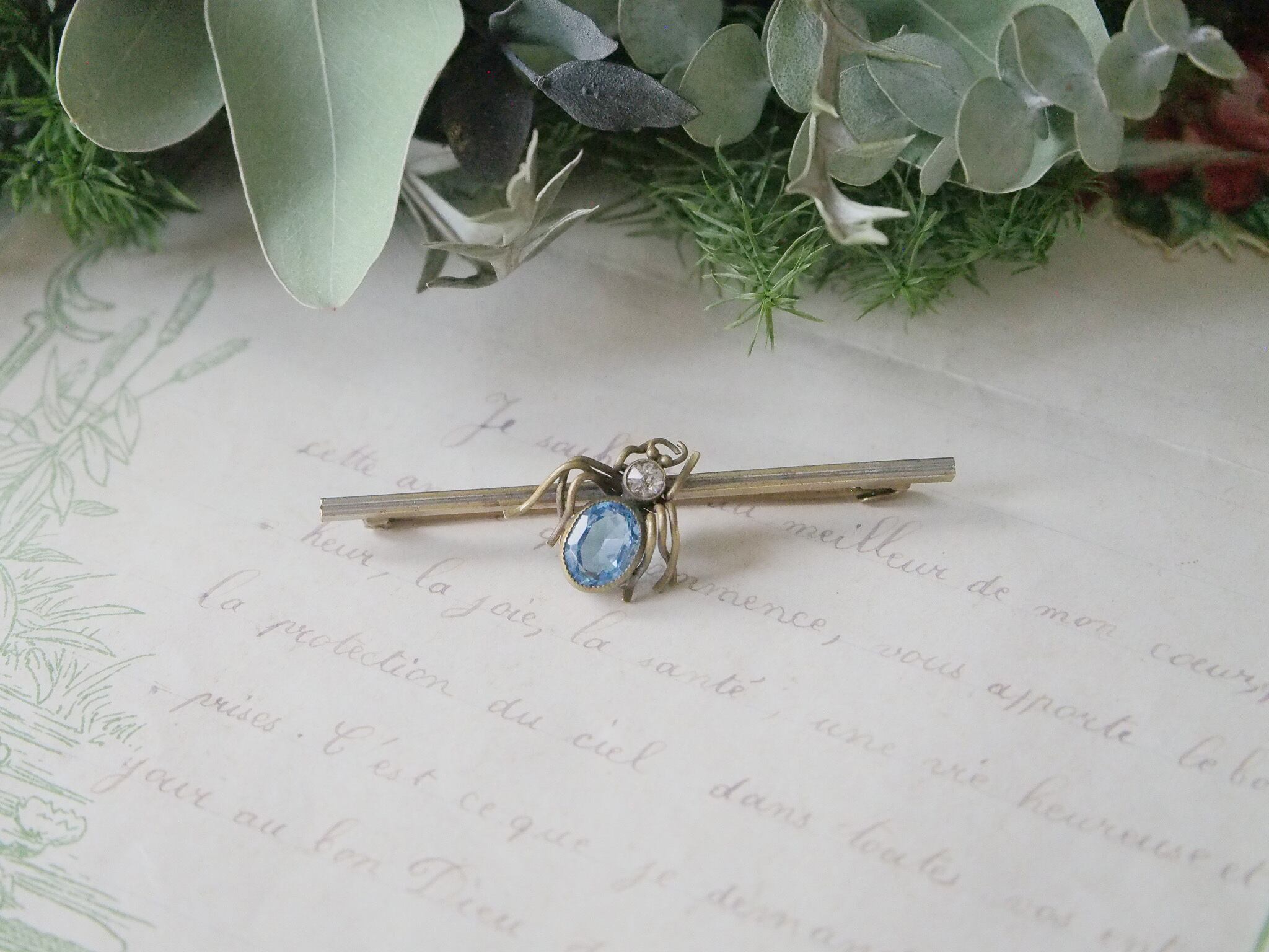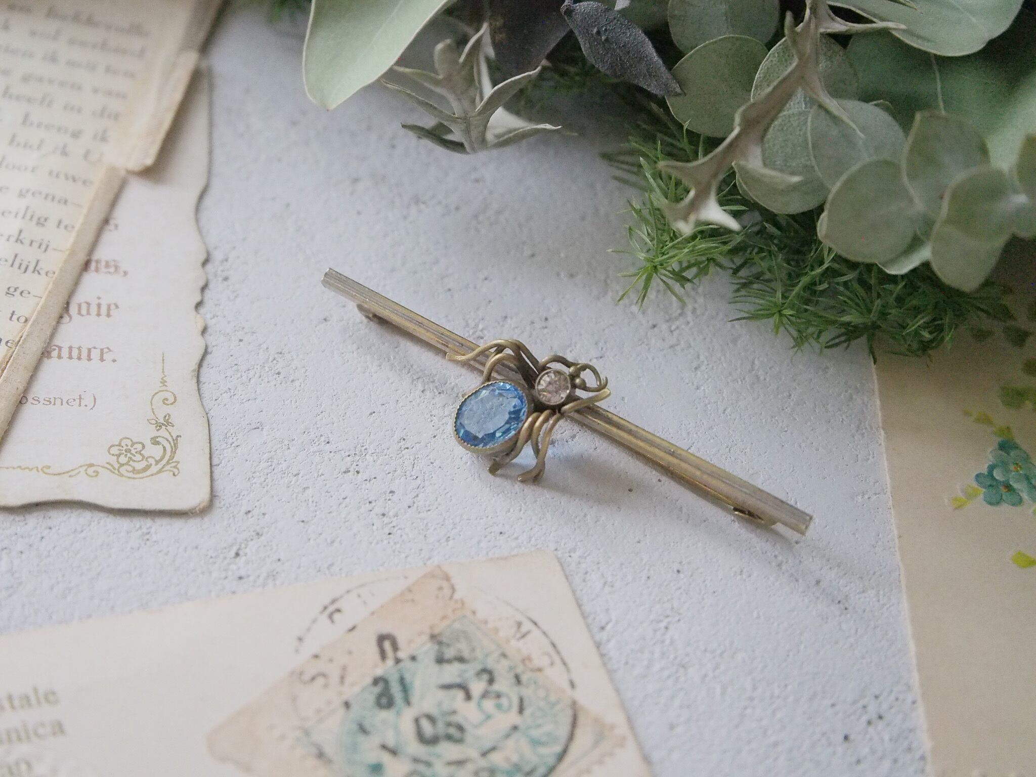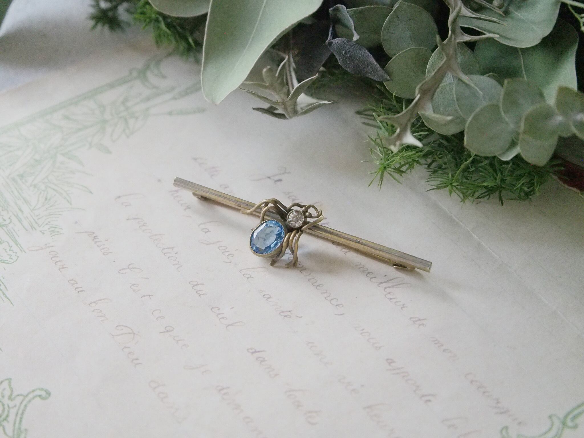 アクアマリンのように透き通ったブルーの、バグモチーフのブローチです。